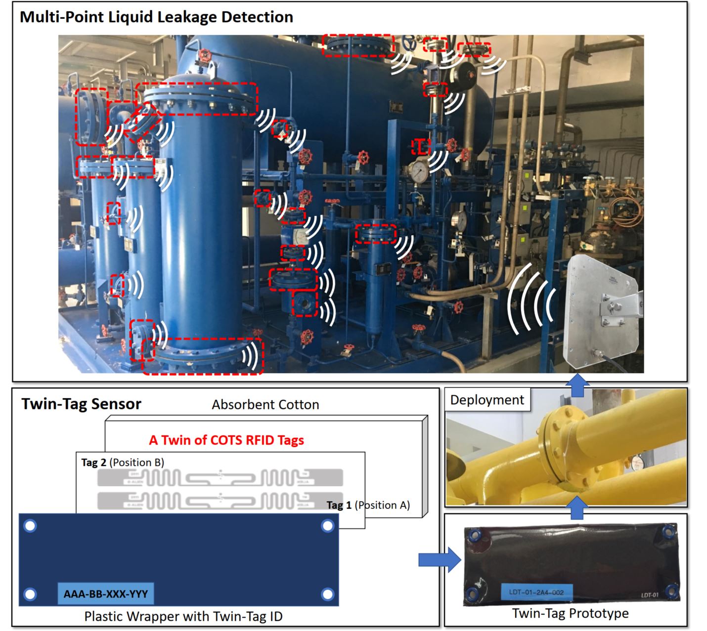 Liquid leakage detection is a crucial issue in the modern industry, which concerns industrial safety. We have built a series of RFID-based solutions, TagLeak and TwinLeak, to detect liquid leakage using COTS RFID devices. Our systems achieve the goals of accuracy and timeliness based on the fact that the inductive coupling between two adjacent tags is highly sensitive to the liquid leaked between them. In addition to detecting the liquid leakage, the upgraded version of the system TwinLeak can further estimate the leakage volume and rate simultaneously. We implement the pototypes of these systems, evaluate their performance across various scenarios, and deploy them in a real-world industrial IoT system. Specifically, TwinLeak achieves a TPR higher than 97.2%, a FPR lower than 0.5%, and a relative property estimation error around 10% on average, while triggering early alarms after only about 4.6mL liquid leaks. TagLeak appears in IEEE ICII 2018 and wins the best paper award, and TwinLeak appears in IEEE INFOCOM 2019 and wins the best presentation of the session award.